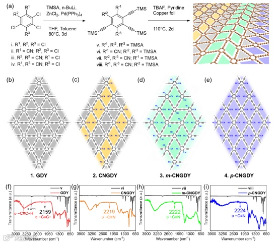 图 1. GDY 系列的合成与表征。(a) GDY (1)、CNGDY (2)、m-CNGDY (3) 和 p-CNGDY (4) 合成路线示意图。(b−e) 分别为 1−4 重复单元的化学结构。(f−i) 四种前体粉末 (v−viii) 及其相应的 1−4 薄膜的 FT-IR 光谱。