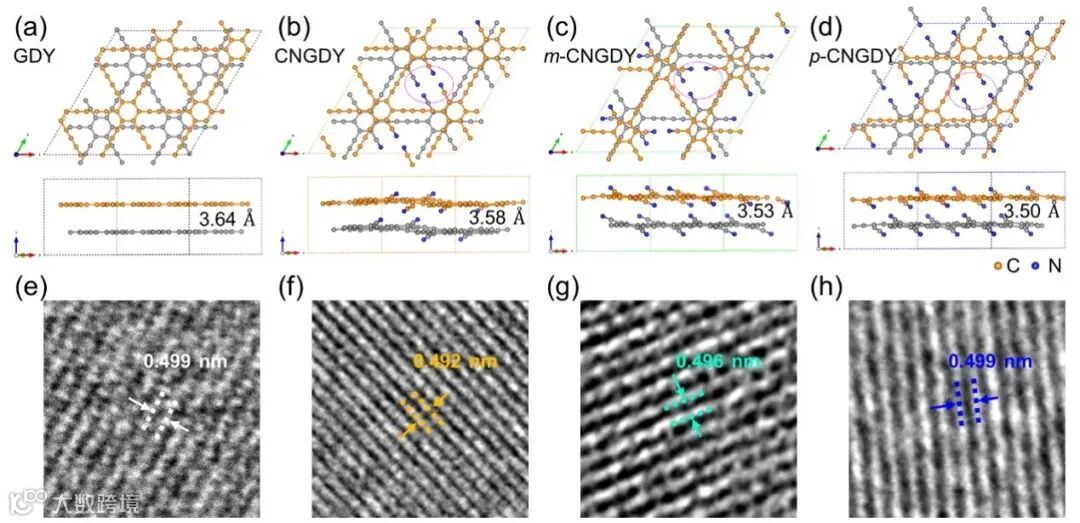 图 3. GDY 结构和晶面间距。(a−d) DFT 优化的 GDY 堆叠位置和层间距离。(e−h) 1−4 晶面的放大 HRTEM 图像。
