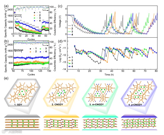 比容量是与吸附能一起影响电极(电池)性能的另一个关键因素,最大理论比容量对电池的性能至关重要。在最大程度保证结构完整性的情况下, 1−4单层的理论储锂个数分别为70、82、83和97。GDY、CNGDY、m-CNGDY和p-CNGDY的理论容量分别为2171.4、2520.2、2527.8和2954.0 mAh g-1 与图6中10 mA·g-1电流密度、0.005-3 V电压窗口下实际测试获得的可逆比容量具有相同的大小排序(546.4(GDY)、861.5(CNGDY)、1060.1(m-CNGDY)、1224.2(p-CNGDY)mAh g-1)。另外,采用恒电流间歇滴定技术(GITT)评估图1−4半电池在三次放电/充电过程中的锂离子迁移速率,结果显示氰基的增加确实可以增强锂离子的迁移(1−4的Log(DLi+ cm2 ·s−1)的均值分别为−11.82、−11.68、−11.58和−11.55)。