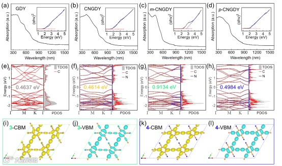 利用固态紫外-可见光测得1−4的光能隙分别为1.9、1.7、2.7和2.0 eV。在图 4e-h 中,计算得出 GDY、CNGDY、m-CNGDY 和 p-CNGDY 单层的直接电子带隙(k = 0 时导带和价带之间的能量差)分别为 0.4637、0.4614、0.9134 和 0.4984 eV。从以上结果可以看出,增加氰基的数量并不一定会导致带隙变窄,位置的作用可能影响更大。
