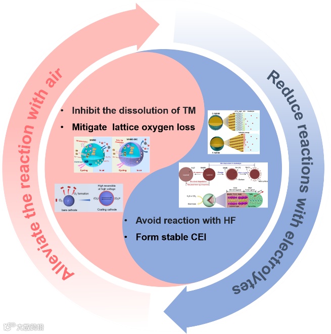 (2)界面涂层提供了一个有效的屏障,防止材料与腐蚀性电解液或空气中的H2O或CO2接触,抑制了副反应,增强了界面的稳定性。界面修饰层还可以减少晶格氧的损失,增强阴离子氧化还原反应的可逆性,而更好地保留活性位点,从而提高电池的循环稳定性。
