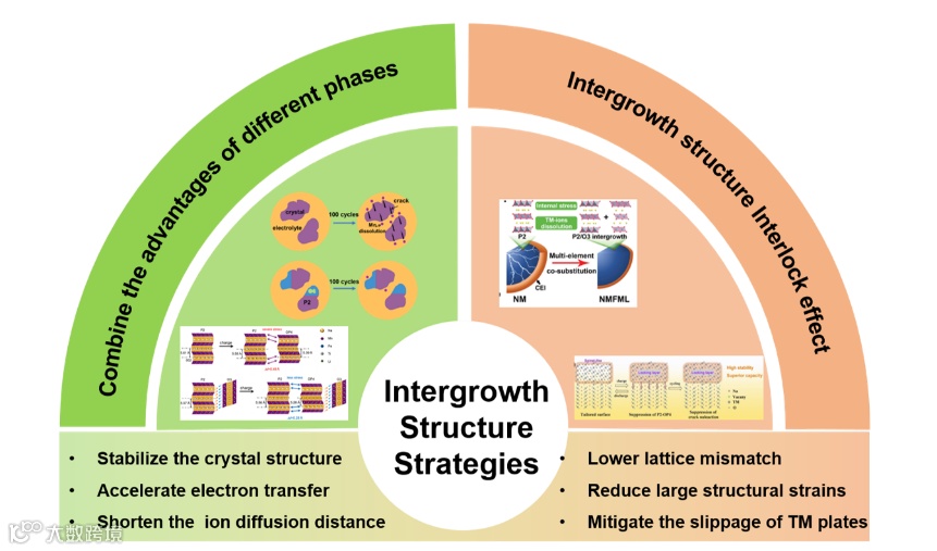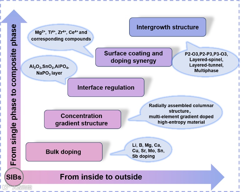 研究人员通过提出不同的修饰策略来提高NaxTMO2的性能。本文从空间尺度由内到外的顺序对NaxTMO2的改性策略进行了总结,包括元素掺杂、浓度梯度结构设计、界面调节、共生结构等。