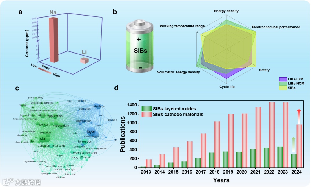 图2 钠离子电池的优势以及层状氧化物的研究现状。