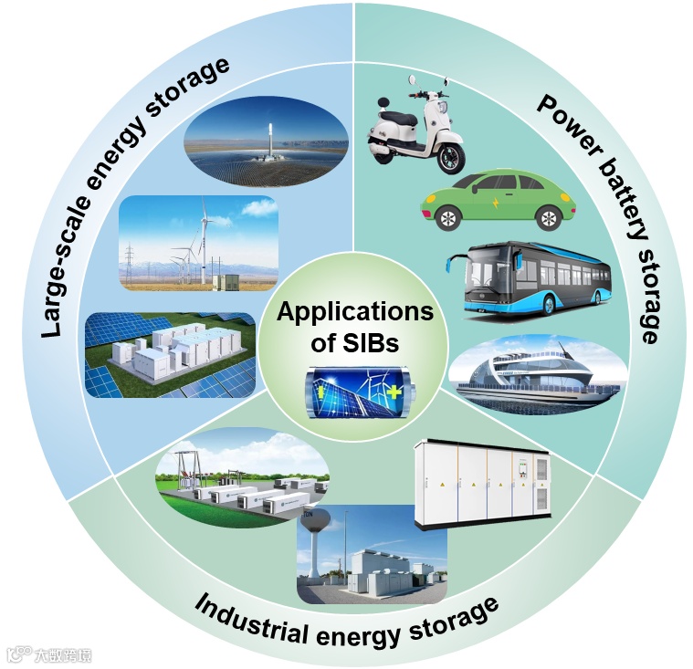 图8 钠离子电池的未来应用:大规模储能,如太阳能发电站和风力发电站;工业储能;动力电池存储,如电动自行车和电动船舶。