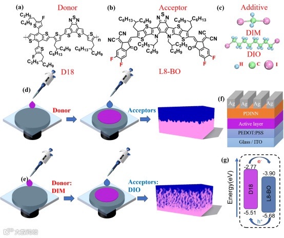 图2.(a)D18,(b)L8-BO,(c)DIM和DIO的化学结构。(d) N-QBHJ(未使用添加剂)和(e)D-QBHJ(使用双添加剂)薄膜的LbL制备流程示意图,(f)器件结构示意图,(g)D18和L8-BO的能级图。
