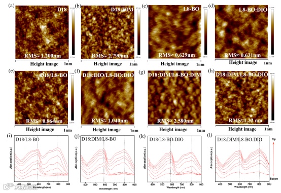 图4.(a)D18薄膜,(b)D18:DIM薄膜,(c)L8-BO薄膜,(d)L8-BO:DIO薄膜,(e)D18/L8-BO膜,(f)D18:DIO/L8-BO:DIO薄膜,(g)D18:DIM/L8-BO:DIM薄膜和(h)D18:1DM/L8-BO:DIO薄膜的AFM高度图像。(i)D18/L8-BO,(j)D18:1DM/L8-BO,(k)D18/L7-BO:DIO和(l)D18:DIM/L8-BO:DIO薄膜的膜厚-深度相关吸收谱。