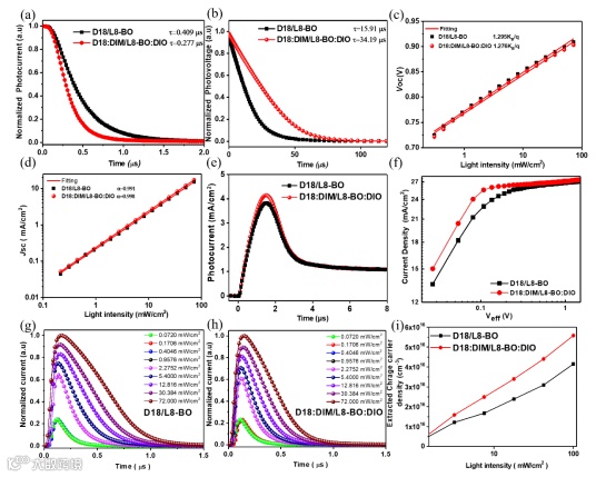 图3归一化(a)瞬态光电流和(a)瞬态光电压曲线。(c)光强与开路电压的关系,(d)光强与短路电流密度的关系。(e)photo-CELIV曲线。(f)净电流与有效电压的关系。(g)D18/L8-BO器件和(h)D18:DIM/L8-BO:DIO器件的瞬态光电流与光强的关系,(i)提取的载流子浓度与光强的关系。