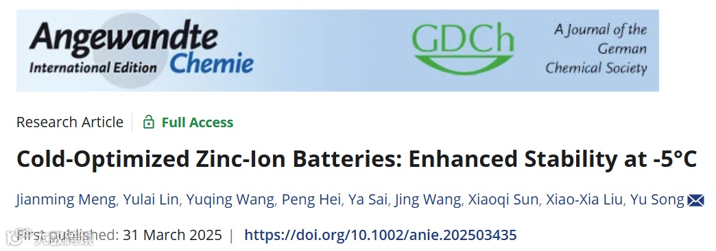 基于此,东北大学宋禹副教授团队在Angew. Chem. Int. Ed.期刊发表题为“Cold-Optimized Zinc-Ion Batteries: Enhanced Stability at -5 °C”的研究论文,团队成员蒙建铭为论文第一作者,东北大学宋禹副教授、刘晓霞教授、孙筱琪教授及燕山大学王静教授为论文共同通讯作者。该研究在近冰点温度下取得水系锌离子电池性能优化的突破性进展,首次揭示亚低温调控ZnSO4电解质的溶剂化重构,通过抑制H⁺嵌入实现CoNiDH(v)电极的电荷存储机制转型,在-5 ℃下实现了32,000次循环后85%容量保持率的超长寿命。结合光谱表征与理论计算,填补了亚低温下水系锌离子电池电荷存储机制的研究空白,为低温水系电池设计提供了全新视角。