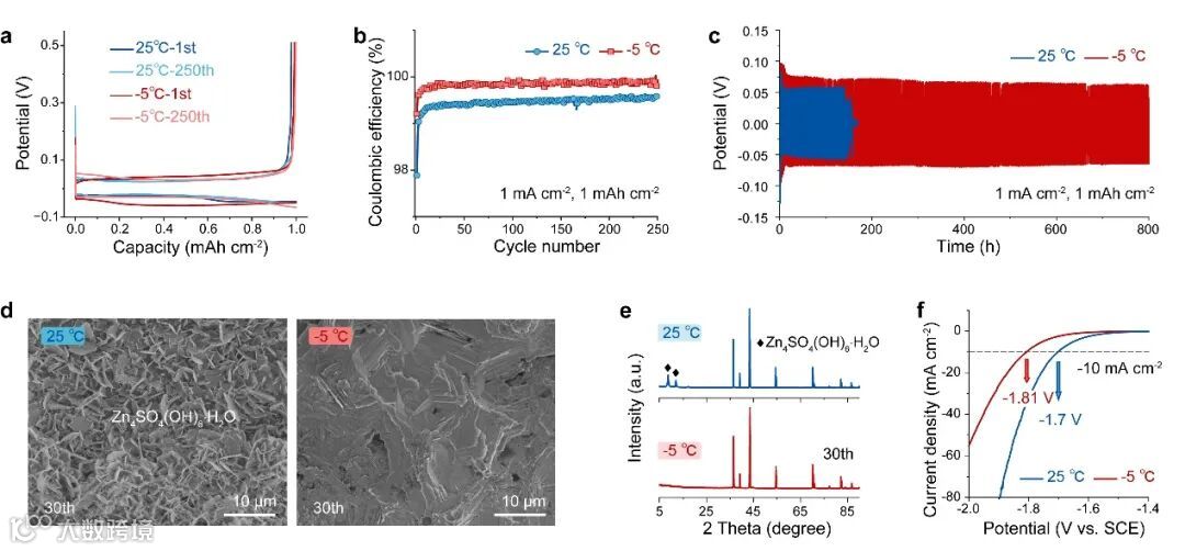 图4. 锌负极在不同温度下的耐久性。(a)不对称Zn//Cu电池在25 ℃和-5 ℃下的充放电曲线。(b)25 ℃和-5 ℃时Cu//Zn电池中镀锌/剥离工艺的库仑效率。(c)电流密度为1.0 mA cm-2、容量为1 mAh cm-2时锌对称电池的循环性能。(d)锌电极在锌对称电池中循环30次后的SEM图和(e)XRD图。(f)Ti电极在饱和K2SO4溶液中在25 ℃和-5 ℃下扫描速率为1 mV s-1时的LSV曲线。