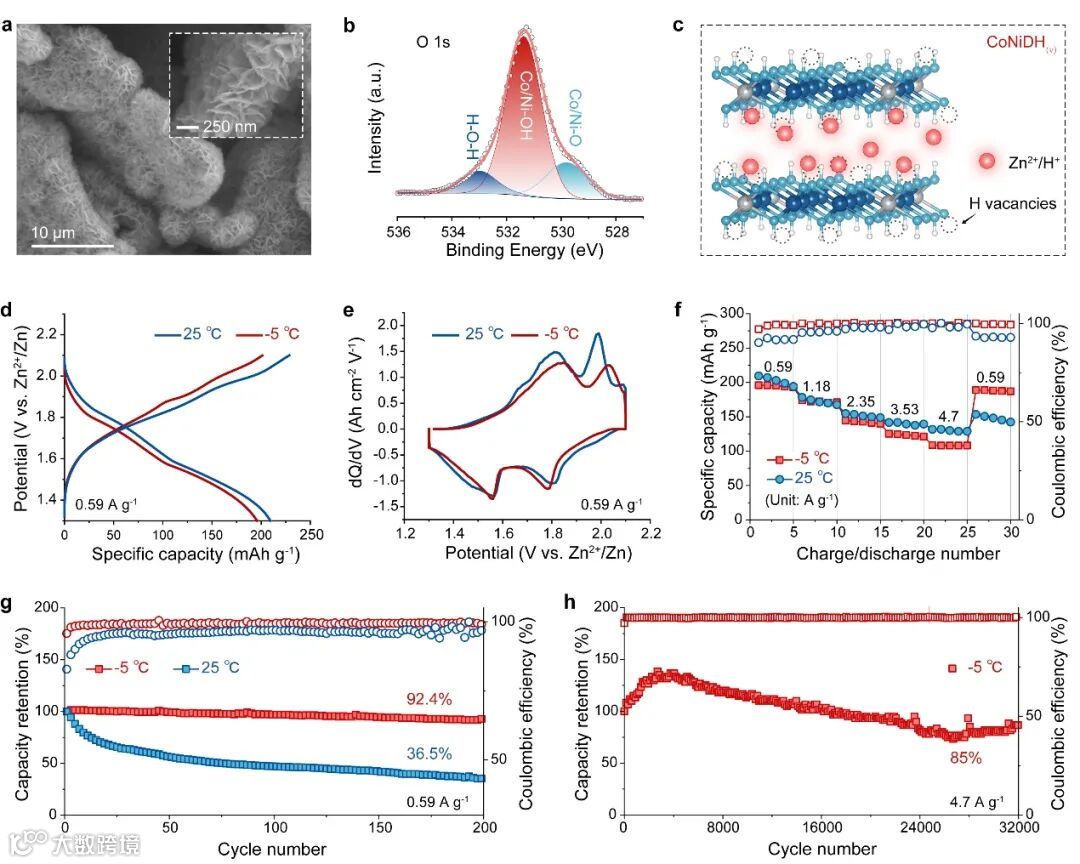 图2. CoNiDH(v)在不同温度下的结构及电化学性能。(a)CoNiDH(v)的SEM图像,插图为放大后的图像。(b)CoNiDH(v)的XPS O 1s光谱。(c)CoNiDH(v)的电荷储存机理示意图。CoNiDH(v)电极在25 ℃和-5 ℃下的电化学性能。(d)电流密度为0.59 A g-1时CoNiDH(v)的恒流充放电曲线和(e)相应的差分容量曲线。(f)速率性能,(g)CoNiDH(v)在0.59 A g-1电流密度下的循环稳定性。(h)在4.7 A g-1电流密度下CoNiDH(v)的循环稳定性。