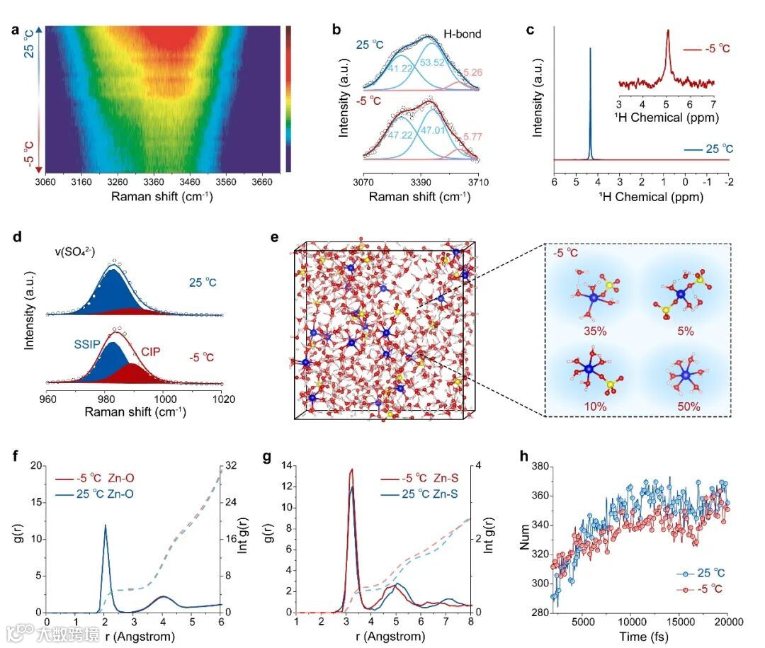 图5. 不同温度下电解质的表征和AIMD模拟。(a)当温度从25 ℃降至-5 ℃时,3 M ZnSO4电解质的原位拉曼光谱。(b)原位测量得到的O-H在25 ℃和-5 ℃时拉伸振动的拉曼光谱。(c)电解质在25 ℃和-5 ℃时的1H NMR谱图。(d)v(SO42-)在25 ℃和-5 ℃时拉伸模式的拉曼光谱。(e)-5 ℃下的MD模拟。(f)Zn-O和(g)Zn-S相互作用RDF图。(h)25 ℃和-5 ℃时模拟系统中的氢键总数。