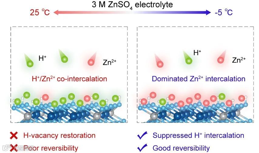 水系锌离子电池(AZIBs)凭借其高安全性、环境友好性和低成本等优势,在大规模储能领域展现出巨大潜力。传统研究主要聚焦于室温及超低温(如-90至-20 ℃)条件下的性能优化,通过电解质工程(如调节氢键网络)抑制电解液冻结以维持离子传导性。然而,介于室温与超低温之间的中间温度范围(如-10至0 ℃)长期被忽视,而该区间实际对应冬季户外、深海环境(-2至5 ℃)等关键场景的需求。研究表明,H+相关的副反应(包括阴极材料的不可逆相变和溶解、阳极析氢及副产物生成)是AZIBs容量衰减的主因,而H+通过Grotthuss机制沿氢键网络扩散的特性可能受温度调控。具体而言,低温环境下氢键强度的增强可能会降低H+的迁移活性,从而有效抑制有害H+副反应。此外,中间温度下未冻结的电解液仍具备离子传导能力,为电池性能的维持提供了可能性。然而,对于温度降低如何影响Zn2+溶剂化结构、H2O电化学活性以及电荷存储机制的变化,目前尚缺乏系统研究。