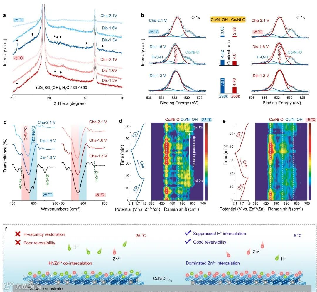 为了揭示CoNiDH(v)电极在不同温度下循环稳定性发生显著变化的根本原因,团队通过多尺度表征(XRD、FT-IR和原位Raman光谱等分析手段)系统地了解温度如何影响电荷存储。XRD分析显示,在25 °C下深度放电至1.3 V时,CoNiDH(v)表面生成Zn4SO4 (OH)6·H2O(JCPDS No.39-0690)六方纳米片结构(图3a),而-5 °C条件下该产物衍射峰强度显著减弱,表明低温有效抑制了H+嵌入导致的副产物。XPS O 1s谱定量分析表明,25 °C放电过程中Co/Ni-OH与Co/Ni-O的比例从初始3.03显著增至7.81(图3b),而-5 °C时该比值仅从2.88升至4.76,证实低温显著减弱H⁺嵌入引发的羟基化反应,FT-IR光谱进一步佐证此现象。原位拉曼动态监测显示(图3d-e),在25 °C时,Co/Ni-OH键的强度明显高于-5 °C,这表明在较高温度下H+嵌入反应更剧烈。此外,在25 °C下的第二次放电过程中,Co/Ni-OH键的强度略低于初始放电时(在图3d中突出显示),这表明CoNiDH(v)中严重的H+嵌入可能会降低电荷存储过程的可逆性,导致容量更快地衰减。上述讨论表明,工作温度会影响CoNiDH(v)中的电荷存储机制(图 3f)。在较低温度(-5 °C)下,放电过程中H嵌入反应得到缓解,Zn2+嵌入在电荷存储过程中占主导地位。然而,嵌入CoNiDH(v)中的H空位,降低了电极的电化学可逆性,并导致容量快速衰减。