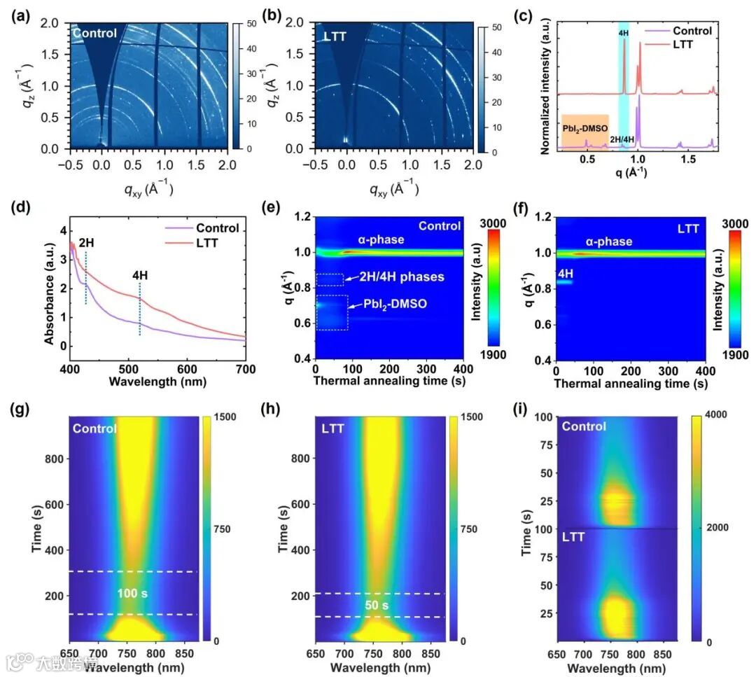 3. 通过采用原位表征技术(如掠入射广角X射线散射(GIWAXS)和光致发光光谱),研究团队深入揭示了LTT如何促进纯相形成并加速整体结晶动力学,为理解结晶过程提供了重要依据。研究表明,LTT工艺能有效抑制复杂DMSO基相的形成,从而获得更均匀稳定的中间态,为后续钙钛矿薄膜的结晶创造了有利条件。