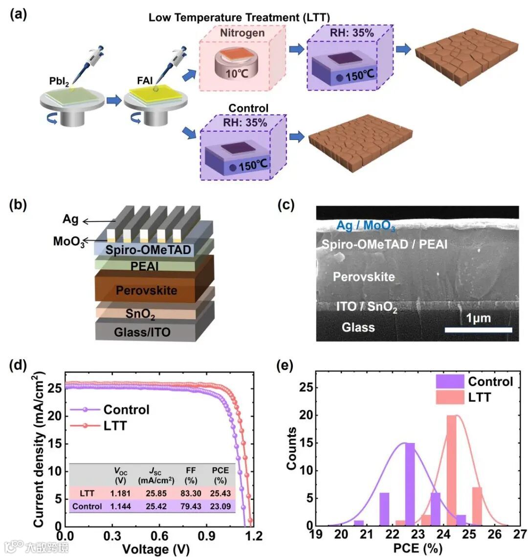1 本研究提出了一种创新的低温处理(LTT)策略,可有效抑制FAPbI3钙钛矿薄膜结晶过程中的不良中间相的形成,从而显著提升薄膜质量。