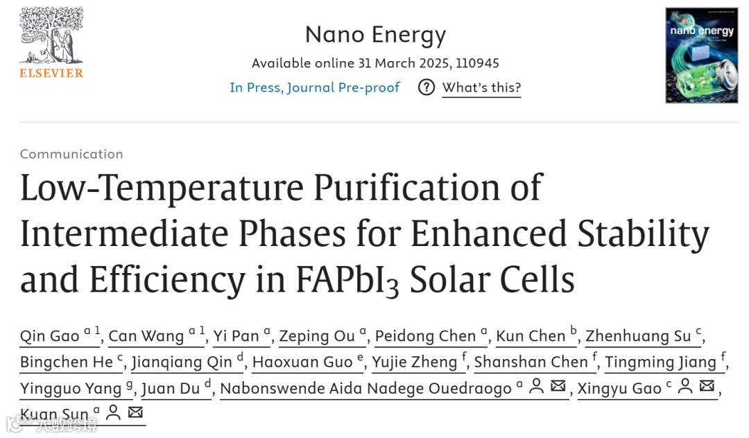 低温净化中间相提高FAPbI3太阳能电池稳定性和效率
