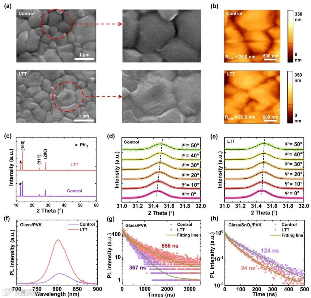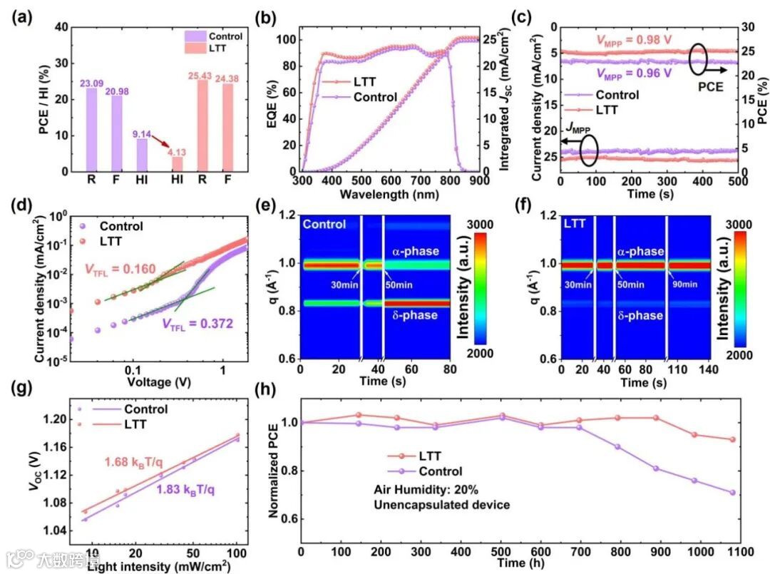 2. 经LTT处理的钙钛矿太阳能电池实现了高达25.43%的功率转换效率(PCE),远超对照组器件,同时表现出更强的电荷传输能力和更低的缺陷密度。