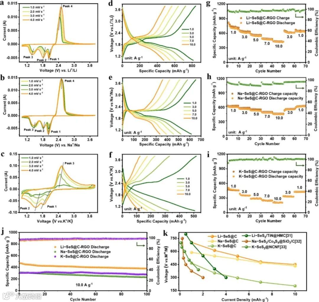 图 4.Li/Na/K-SeS@C-RGO电池的电化学测量。(a-c)三个细胞在不同扫描速率下的CV曲线。(d-f) 三个电池在不同电流密度下的放电-充电曲线。(g-i)三种电池在不同电流密度下的倍率能力。(j)三个电池在10.0 A g-1下的高倍率循环性能。(k)与最近报道的文献的速率性能比较。