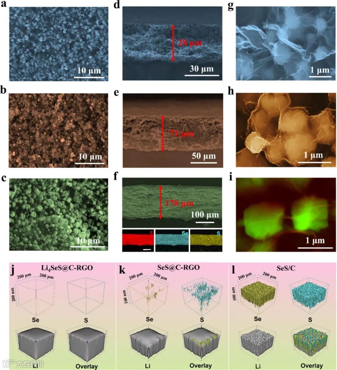 图 3.三种正极材料的形貌和组成。(a-c)俯视图和(d-f)截面视图和(g-i)的高倍率SEM图像:(a,d,g)Se−GO, (b,e,h)SeS@C-RGO和(c,f,i)Li4SeS@C-RGO。(j-l)Li-Li4SeS@C-RGO、Li−SeS@C-RGO和Li-Se/S0-C电池的Li金属阳极TOF-SIMS元素分布的3D视图.