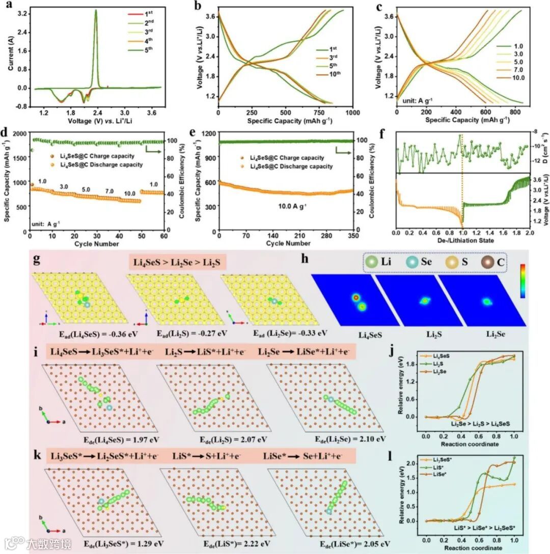 图 5.Li-Li4SeS@C-RGO电池的电化学测量。(a)CV 曲线。(b)初级周期的电压分布。(c)不同电流密度下的电压分布。(d)不同电流密度下的倍率能力。(e)10.0 A g-1下的长循环性能。(f)GITT概况。(g, h)关于Li4SeS、Li2S和Li2Se在石墨烯基底上的吸附能的理论计算。(i-l)关于(i,j)Li4SeS、Li2S和Li2Se以及(k,l)Li3SeS*、LiS*和LiSe*的分解能的理论计算。