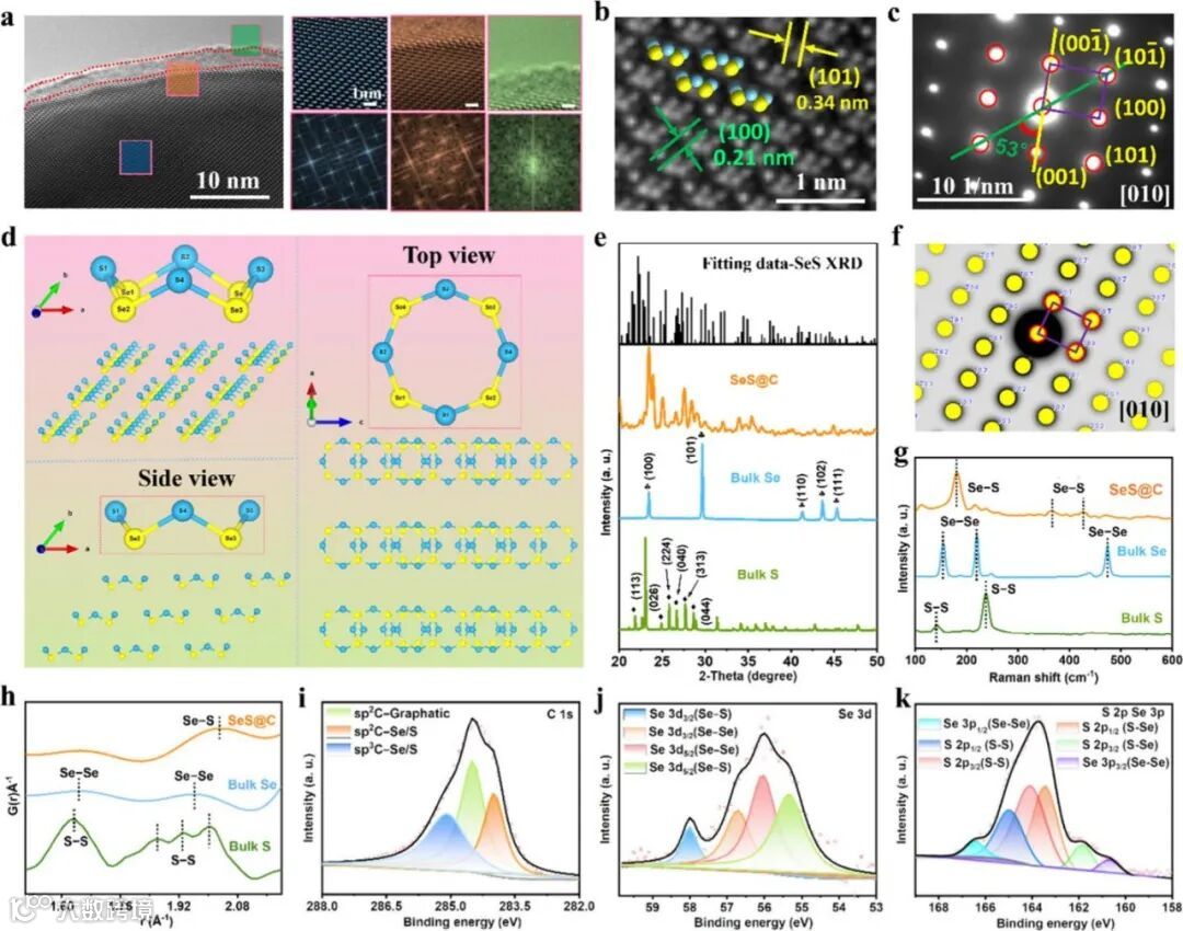 图 2.SeS@C的结构表征和SeS的结构模拟。(a)TEM,(b)HRTEM,(c)SeS@C的SAED。(d)SeS的模拟结构图。(e)Se、S、SeS@C和模拟SeS的XRD图案。(f)SeS的模拟SAED模式。(g)Se、S和SeS@C的拉曼光谱。(h)Se、S 和SeS@C的PDF简介。SeS@C的(i)C、(j)Se和(k)S的XPS 谱。