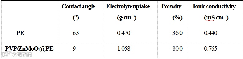 表 1. PE和PVP/ZnMoO4@PE隔膜的性能
