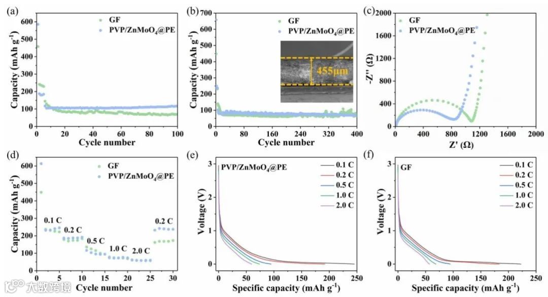 图5. 使用PVP/ZnMoO4@PE隔膜和GF隔膜组装的半电池的电化学性能:(a) 0.5 C时的循环性能,(b) 1.0 C 时的循环性能,(c) 交流阻抗谱,(d) 倍率性能,以及使用 (e) PVP/ZnMoO4@PE 隔膜和 (f) GF 隔膜组装的电池的放电曲线。