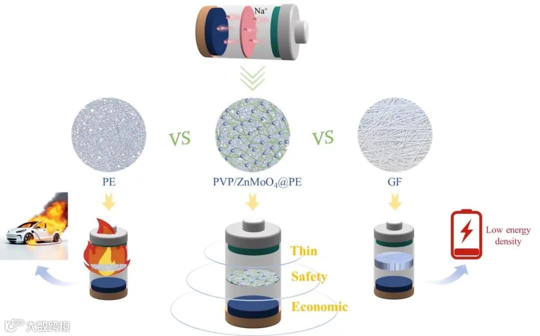 图1. 优化的 PVP/ZnMoO4@PE隔膜与PE隔膜和GF隔膜在SIB中的比较示意图