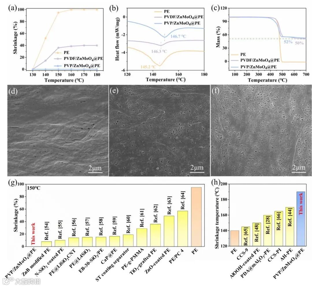 图3. (a) 不同温度下保温30分钟的热收缩率(%)。(b)PE、PVDF/ZnMoO4@PE和PVP/ZnMoO4@PE的DSC曲线和(c)TG曲线。(d) PE、(e) PVDF/ZnMoO4@PE和(f) PVP/ZnMoO4@PE在140 °C热处理30 分钟后未涂覆面的SEM图像。(g) 已报道的聚乙烯基隔膜在150 °C下加热后的收缩率比较。(h) 已报道的聚乙烯基隔膜的收缩起始温度比较。
