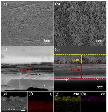 图 2. PE和PVP/ZnMoO4@PE 的俯视SEM图像:(a) PE和 (b)PVP/ZnMoO4@PE,侧视SEM图像:(c) PE和 (d)PVP/ZnMoO4@PE,(e-h)PVP/ZnMoO4@PE隔膜的元素分布图谱。