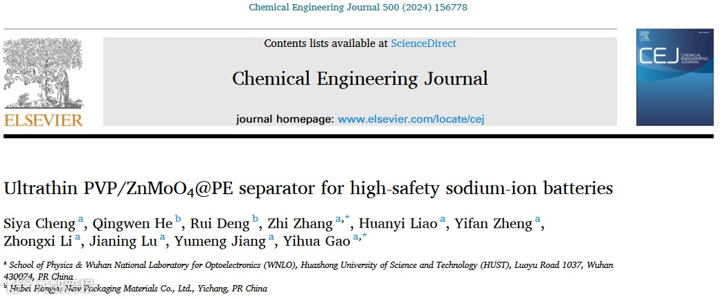 华中科技大学的张智/高义华团队在国际知名期刊Chemical Engineering Journal上发表题为“Ultrathin PVP/ZnMoO4@PE separator for high-safety sodium-ion batteries”的研究工作。该工作选用聚乙烯吡咯烷酮(PVP)为粘合剂、ZnMoO4为无机改性材料,采用了涂覆法设计并实现了一种可用于高安全性锂电池和钠离子电池的超薄PVP/ZnMoO4@PE复合隔膜,新型PVP/ZnMoO4@PE隔膜为实际应用和商业化提供了启示。