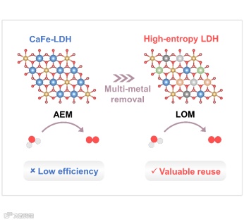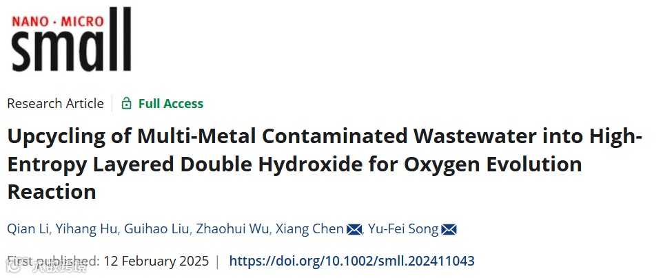 近日,来自北京化工大学的宋宇飞教授团队在国际知名期刊Small上发表题为“Upcycling of Multi-Metal Contaminated Wastewater into High-entropy Layered Double Hydroxide for Oxygen Evolution Reaction”的研究文章。该文章将CaFe水滑石用于多金属污染废水的治理,对Co2+、Ni2+、Cu2+和Zn2+的去除率分别达到98.0%、98.6%、100%和100%。重金属通过对CaFe中Ca2+进行同晶取代,形成了高熵水滑石(CaCoNiCuZnFe)。同时,由于不同离子半径的金属的引入以及Ca2+的溶解,导致了晶格畸变和金属空位的形成。得益于高熵材料的稳定性及丰富的活性位点,CaCoNiCuZnFe在OER中表现出优异的催化性能,在10 mA cm2+电流密度下的过电位为310.7 mV,并在250小时内保持长期稳定性。本研究策略成功将多金属污染废水资源化,实现了环境修复与资源利用的双重目标。