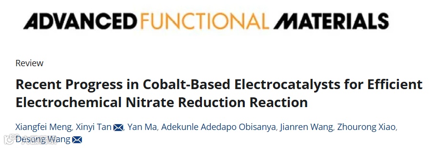 基于此,来自燕山大学环境与化学工程学院王德松教授、谭新义副教授团队,在国际知名期刊Advanced Functional Materials上发表题为“Recent Progress in Cobalt-Based Electrocatalysts for Efficient Electrochemical Nitrate Reduction Reaction”的综述文章。该文章总结了钴基催化剂应用于高效电还原硝酸根制氨反应的最新进展并提出了相应的设计策略(图1)。具体可分为五个类别,其中包括钴基氧化物和氢氧化物、合金、金属和杂原子掺杂、金属有机框架及其衍生物。对每个类别进行了深入讨论,辅以独立的插图,清晰传达了相应的设计构想和理念。最后,讨论了NO3−RR体系中目前在科学和技术层面上面临的挑战以及展望了该体系构建的前景,期望该综述能够为NO3−RR钴基电催化剂的合理设计提供见解和指导,并加速推进其实际应用进程。