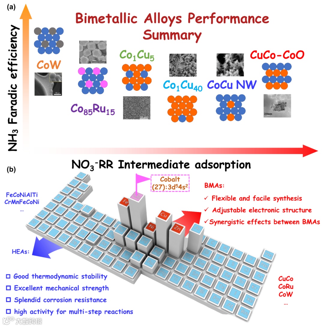 图3. a) 钴基合金在硝酸盐还原反应(NO3−RR)过程中,对反应中间体的吸附能力与氨氮产物法拉第效率(NH3 FE)之间的关系。b) 钴基双金属合金和高熵合金中各金属使用频率。