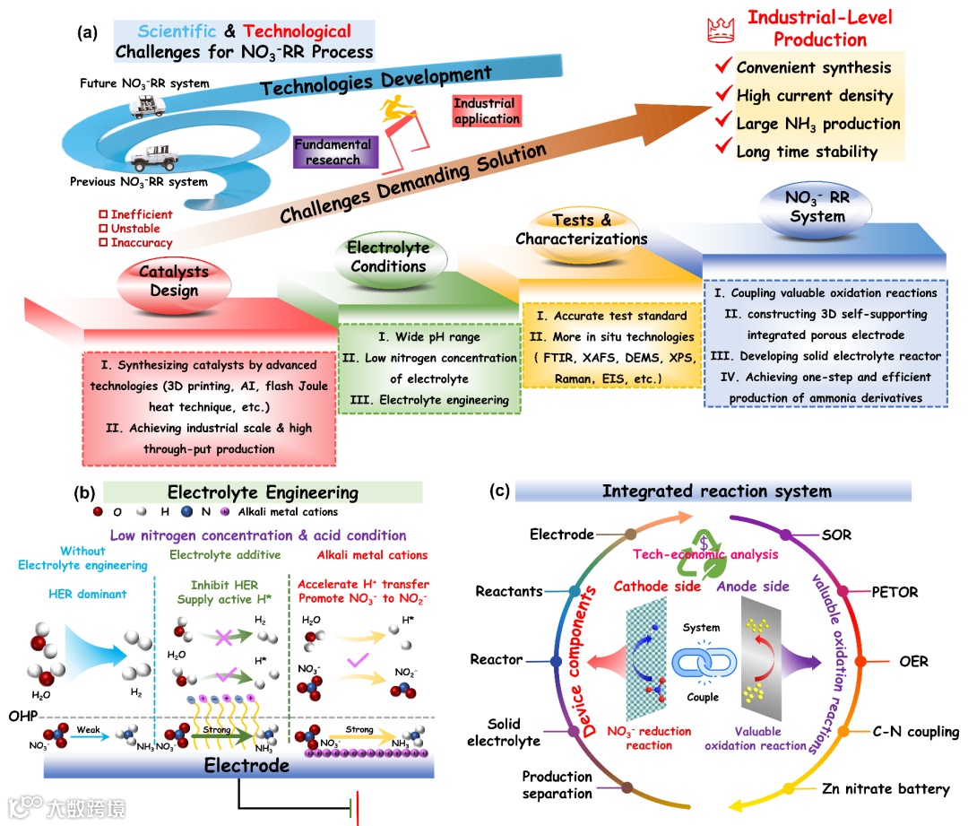 图6. a) NO3−还原反应(NO3−RR)体系科学上和技术上的挑战。b) 利用添加剂和碱金属离子,并开发电解液工程调节电催化剂-电解液界面。c) NO3−RR集成反应系统。