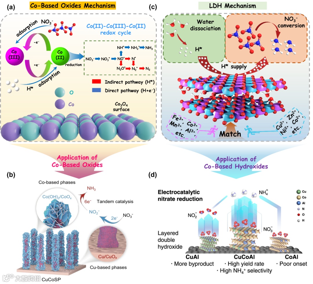 图2. a) 钴基氧化物应用于NO3−RR的反应机理。Co(II)-Co(III)-Co(II) 循环在Co3O4表面的促进作用。b) 串联Cu/Co壳-核电催化剂(Co(OH)2/CoOx)应用于NO3−RR。c) 钴基氢氧化物应用于NO3−RR的反应机理。d) 三金属LDH电催化剂(CuCoAl-LDH)应用于NO3−RR。