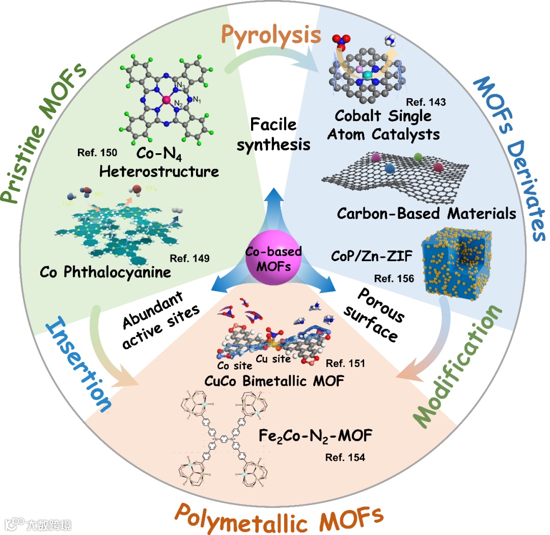图5. 钴基金属有机框架(MOFs)及其衍生物的分类,包括原始MOFs、多金属MOFs和MOFs衍生物(包括单原子催化剂(SACs)、金属氧化物和碳基材料)。