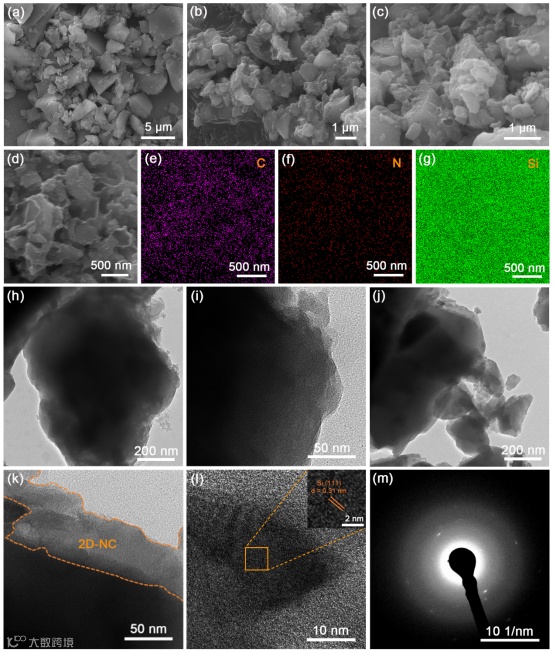 图3. 形貌和结构分析:(a) SiO, (b) SiO@g-C3N4和(c, d)SiO@2D-NC的SEM图;(e) C、(f) N、(g) Si元素的能谱图;(h, i)SiO@g-C3N4和(j, k) SiO@2D-NC的TEM图像,SiO@2D-NC的高分辨率TEM图像(I)和SAED模式图(m)。