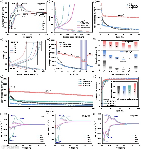 图4. 半电池性能:(a) SiO@2D-NC阳极的CV曲线,(b, c) 0.2 A g−1时的循环性能曲线, SiO、SiO@g-C3N4和SiO@2D-NC阳极的 (d, e) 倍率性能和 (f) 相应的容量保持率,(g) 1.0 A g−1下循环曲线和(h) SiO、SiO@g-C3N4、SiO@c-NC和SiO@2D-NC阳极的CE和ACE曲线;(i) SiO、(j) SiO@g-C3N4和 (k) SiO@2D-NC阳极的dQ/dV曲线。