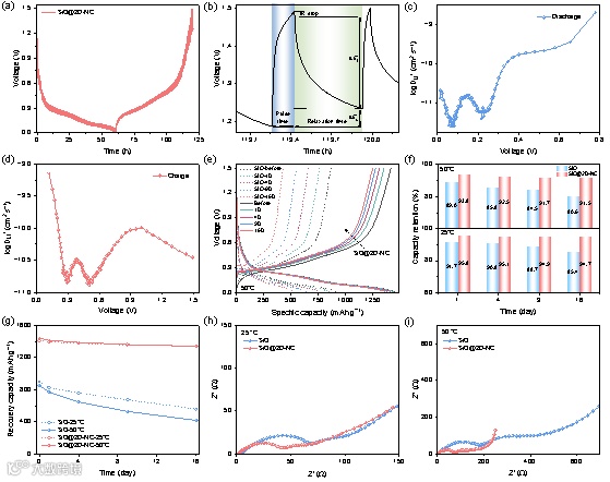 图6. (a, b) SiO@2D-NC阳极的GITT曲线; SiO@2D-NC阳极的放电 (c) 和充电 (d)过的DLi+;(e) 50 ℃时的充放电曲线;在不同的存储时间条件下,不同温度下SiO和SiO@2D-NC阳极的 (f) 容量保持率和 (g) 恢复容量;存储16天后SiO和SiO@2D-NC阳极在 (h) 25 ℃和 (i) 50 ℃时的EIS曲线。