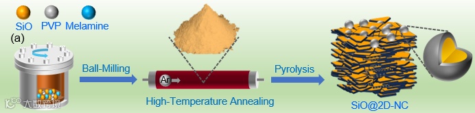 一氧化硅(SiO)具有高达2680 mAh g⁻¹的理论比容量,因而受到越来越多的关注。在初始嵌锂过程中,SiO与锂发生不可逆反应,生成Li₂O和锂硅酸盐(如Li₂SiO₃、Li₂Si₂O₅和Li₄SiO₄),从而形成一个缓冲层以缓解体积变化。如此,SiO负极相比于硅(Si)负极展现出更佳的循环性能。但是,SiO在循环过程中经历高达200%的体积膨胀,这不可避免地导致负极导电网络的崩溃和不稳定固体电解质界面(SEI)膜的形成。其中,碳包覆已被广泛用于提升SiO负极的电子导电性并降低其体积膨胀;然而,电化学稳定性仍然较低,且SiO@C纳米复合材料的大规模合成依然是一个难题。