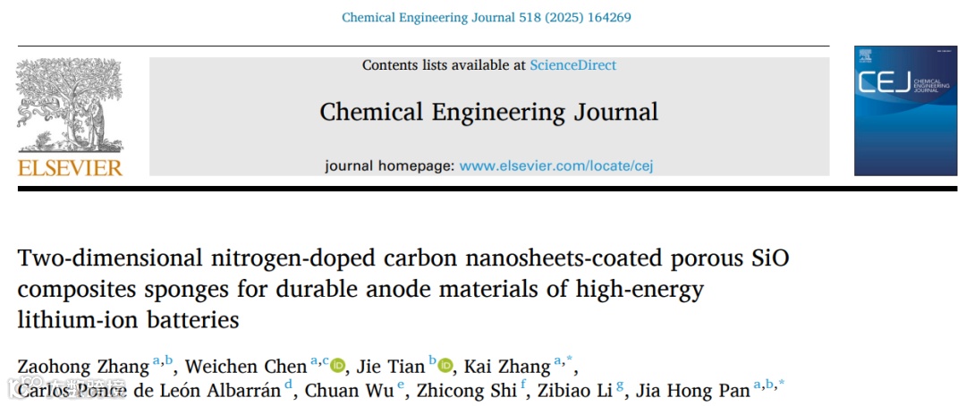 近日,来自华北电力大学张锴教授与广西大学的潘家鸿教授团队,在国际知名期刊Chemical Engineering Journal上发表题为“Two-dimensional nitrogen-doped carbon nanosheets-coated porous SiO composites sponges for durable anode materials of high-energy lithium-ion batteries”的观点文章。探究了该二维材料的结构、形貌、化学组成以及导电性等特性,进一步详细分析了该二维材料在锂电方面的应用潜力。