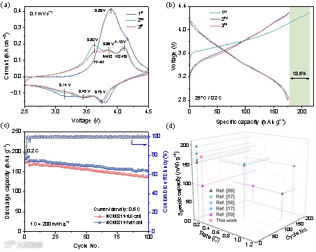图7. SiO@2D-NC||NCM811全电池性能:(a) 前三个循环的CV曲线;(b) 前三圈循环充放电曲线;(c) NCM811半电池和全电池的循环性能;(d)与其他报道的SiO||NCM811全电池性能比较。