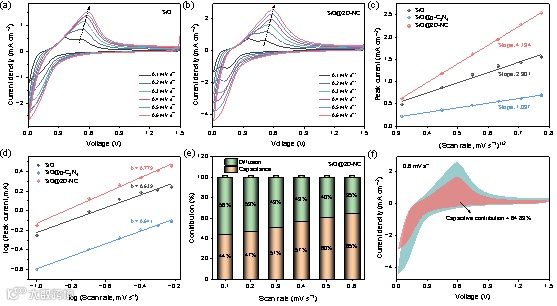 图5. 动力学分析:(a) SiO和(b) SiO@2D-NC阳极在不同扫描速率下的CV曲线; SiO、SiO@g-C3N4、SiO@2D-NC阳极的 (c) Ip与v1/2的关系和 (d) logi与logv的关系;(e-f) SiO@2D-NC阳极在不同扫描速率下的扩散和电容贡献比率。