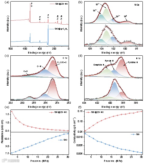 图2. XPS和导电特性分析:(a) SiO@g-C3N4和SiO@2D-NC的XPS全谱图,(b) Si 2p, (c) C 1s和(d) N 1s的高分辨率XPS光谱;(e) SiO和SiO@2D-NC的电阻曲线和 (f) 电子电导率曲线。