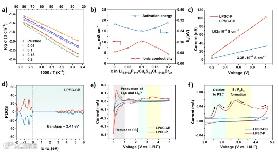 掺杂后硫化物电解质(LPSC-CB)的离子电导率在室温下达到10.3 mS cm−1。Cu和Br的掺入提高了离子电导率是由于多种因素的相互作用。一方面,4a和4d Wyckoff位点的Br取代改变了Li亚晶格,增加了结构位点的无序性,有助于锂的扩散。另一方面,Cu2+对P5+的多价取代增加了电池中Li+的浓度,这降低Li+迁移的能量势垒。此外,LPSC-CB电解质的电子电导率为3.35 nS cm−1。随后使用DFT进行了分波态密度计算,掺杂后硫化物电解质的带隙增加到2.41 eV。带隙的增加导致更困难的电子跳跃,从而导致电子电导率的降低。