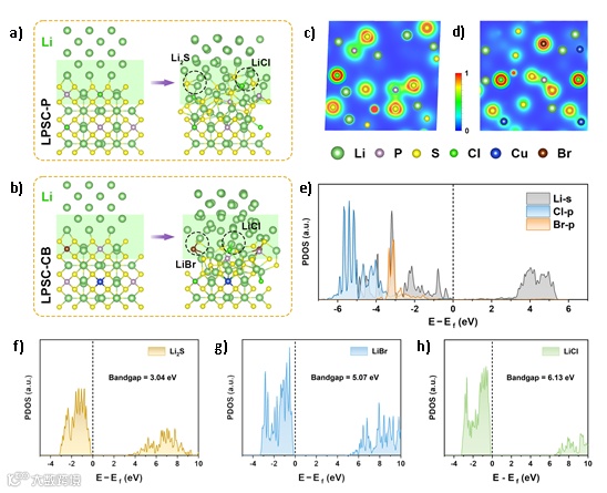 计算结果发现,Li/LPSC-P界面形成Li-S键,导致界面处锂通量不均匀,这促进了枝晶生长并加速了界面退化。相反,Li/LPSC-CB界面上Li-Cl和Li-Br键的形成表明Cl/Br原子和S原子之间存在竞争关系,这阻碍了S原子与Li的相互作用。电子局域函数分析证明,CuBr2的掺杂导致LPSC-CB中的电子重新分布。由于电负性的差异,Cl/Br原子周围的电子密度高于S原子,这表明Cl/Br分子优先与Li结合。因此,LiCl@LiBr在Li/LPSC-CB的界面上产生了保护层,抑制了界面反应。DFT计算表明,Li/LPSC-CB界面的优越性可归因于带隙的加宽以及LiCl和LiBr键的形成。CuBr2直接影响硫化物电解质的内在电子结构和界面组成,从而有效地抑制了整个循环过程中的界面氧化还原反应。