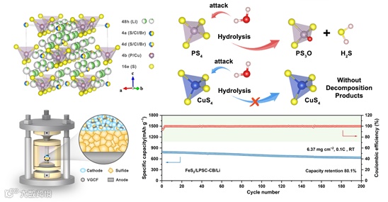 摘要图:硫银锗矿型硫化物电解质的晶体结构,空气稳定性的机理,以及全固态电池的循环性能
