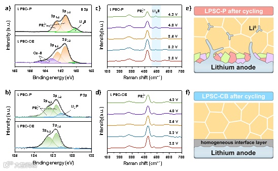 循环后Li/LPSC-P界面出现了Li2S、Li3P的特征峰,表明在Li/LPSC-P界面上发生了界面副反应。而循环Li/LPSC-CB界面的没有强烈的Li2S和Li3P特征峰。非原位的拉曼测试进一步验证了Li/LPSC-CB界面的稳定性。Li/LPSC-P的界面处在490.2 cm−1处出现一个峰值,来自于Li2S的特征振动,强度随着充电电压的增加而逐渐提高。