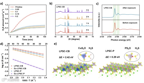 当暴露在湿度为20%的潮湿空气中时,LPSC-P会产生大量的H2S气体,LPSC-CB释放的H2S明显较少,这与软硬酸碱理论一致,即Cu-S键比P-S键对H2O反应的抵抗力更大。P的K边的X射线吸收近边缘光谱证明了P的化学环境在暴露前后没有变化。暴露的LPSC-CB的离子电导率在室温下略有下降,而暴露的LPSC P的离子电导率急剧下降至3.72×10−4 S cm−1。为进一步验证LPSC-CB的空气稳定性,采用DFT对氧取代反应能(ΔE)进行计算。通常,硫化物中PS4四面体的降解与氧原子对硫原子的取代反应有关。LPSC-P和LPSC-CB的氧取代能分别为0.29 eV和2.42 eV。这些结果表明,CuS4四面体中的Cu-S键能强于PS4四面体中的P-S键能,从而在LPSC-CB电解质中形成了稳定的晶体结构。